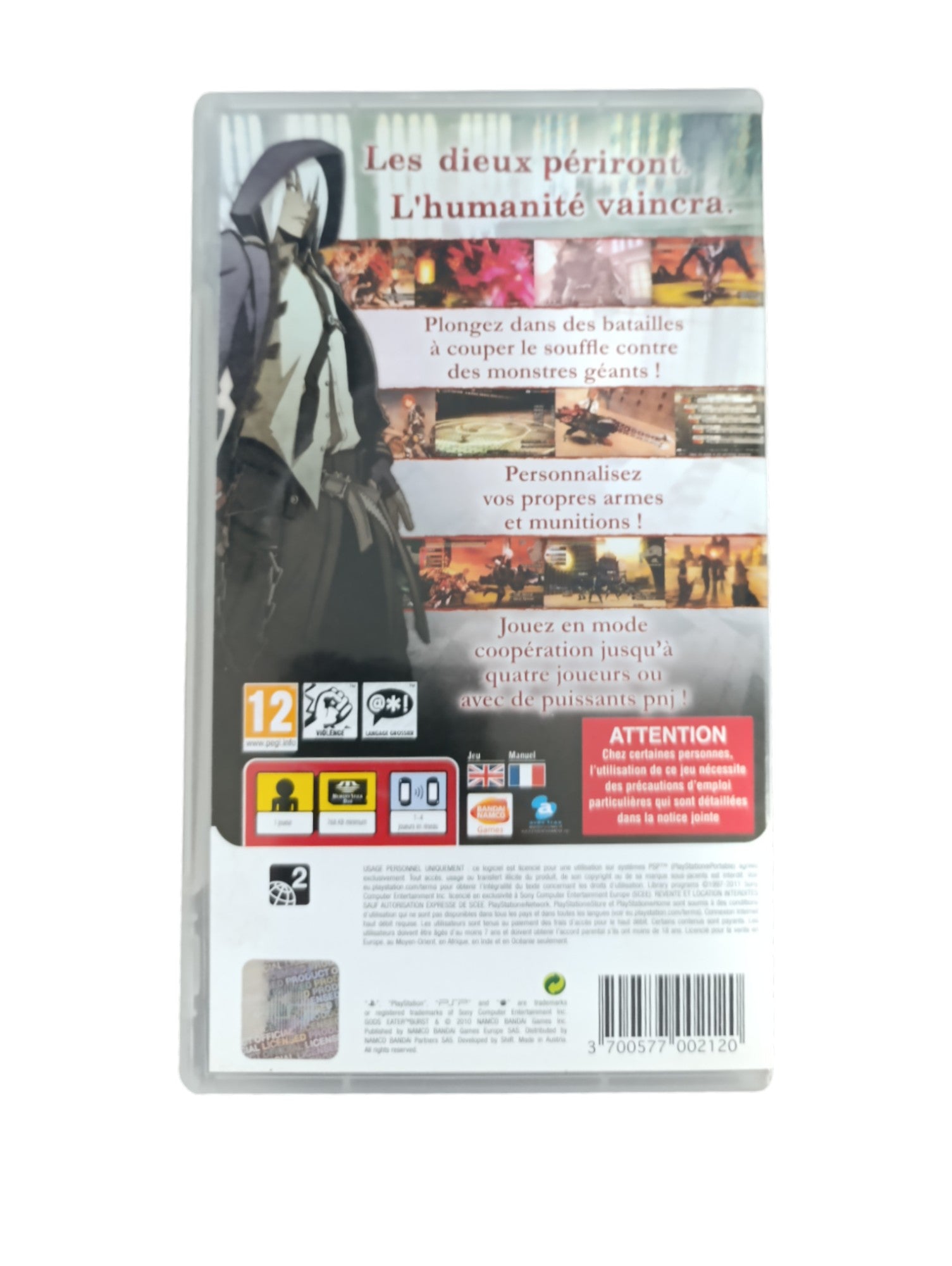 Produit vendu : Jeu Gods Eater Burst pour PSP, complet avec boîte, UMD et notice. Produit original Bandai Namco, testé et fonctionnel.