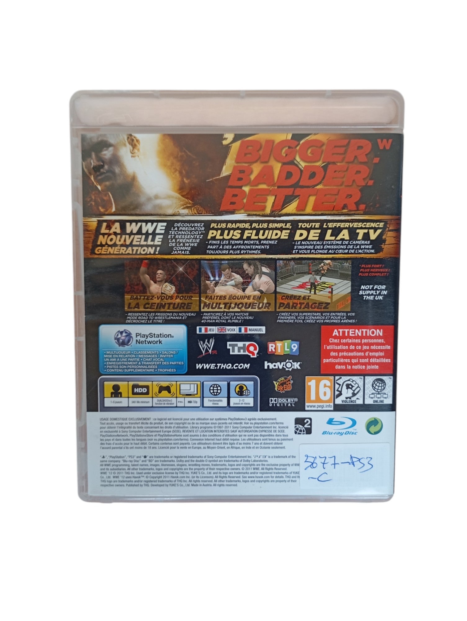 WWE'12 est un jeu de combat sur Playstation 3. Retrouvez toutes les stars du ring dans ce quatorzième opus de la célèbre franchise. Le jeu comporte de nombreuses innovations comme l'adaptation de vos techniques à l'état de santé de votre adversaire, un nouveau système de soumission et des contrôles plus intuitifs. Un outil inédit nous permet également de créer nos propres arènes.