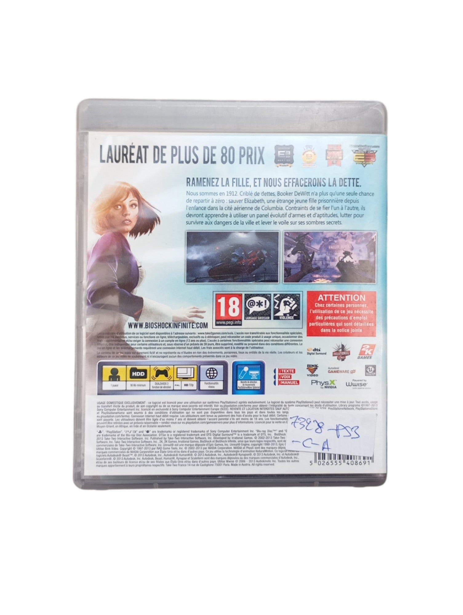 Bioshock Infinite sur PS3 est un jeu d'action à la première personne. Le titre entraîne le joueur en 1912 et le glisse dans la peau de Booker DeWitt, homme de main et détective endetté. Sa mission consiste à ramener à New York une jeune femme manifestement retenue dans Columbia, une mystérieuse ville flottante. On utilisera pour cela un arsenal varié ainsi qu'une palette de pouvoirs baptisés Toniques